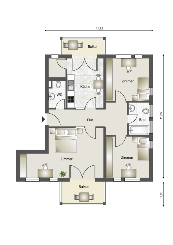 Ein Grundriss, der sowohl Singles, Paaren als auch kleinen Familien vielfältige Nutzungsmöglichkeiten eröffnet.
